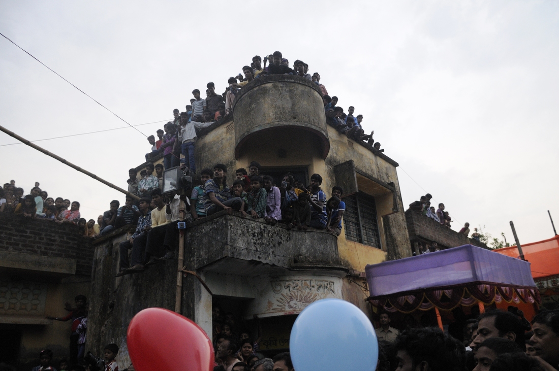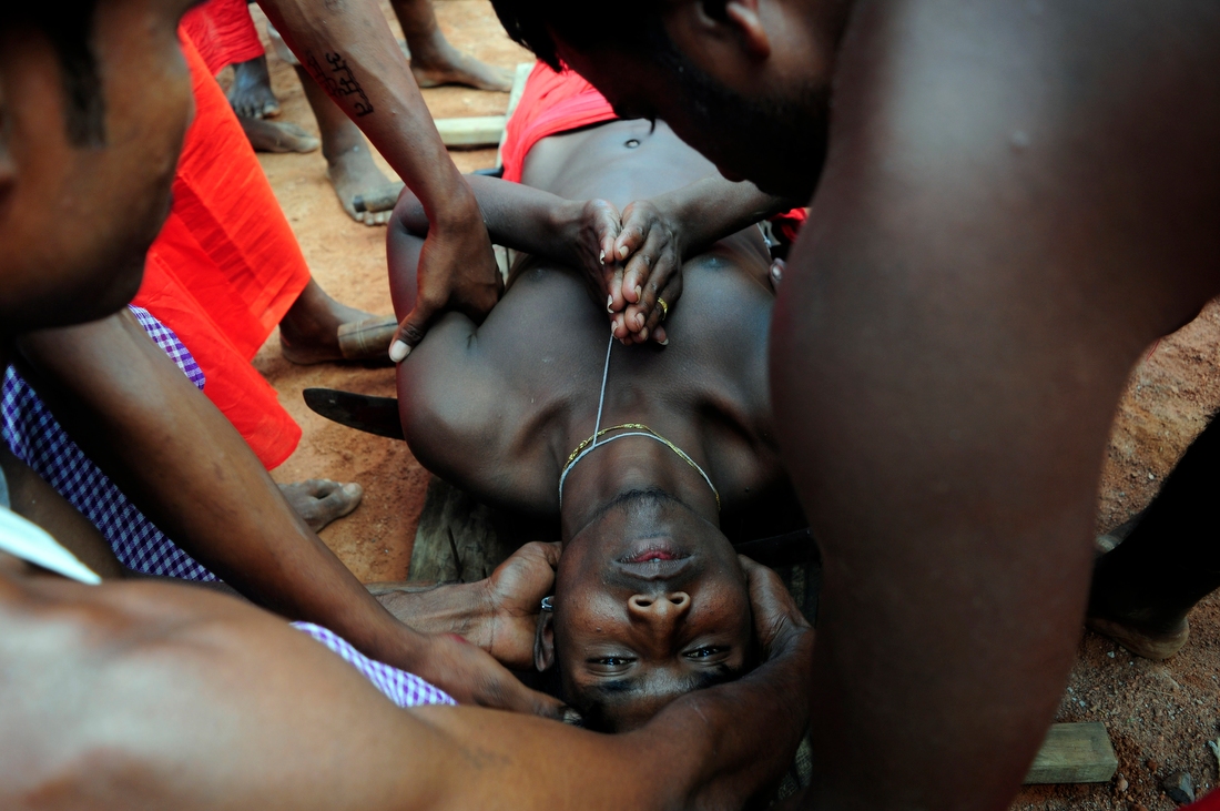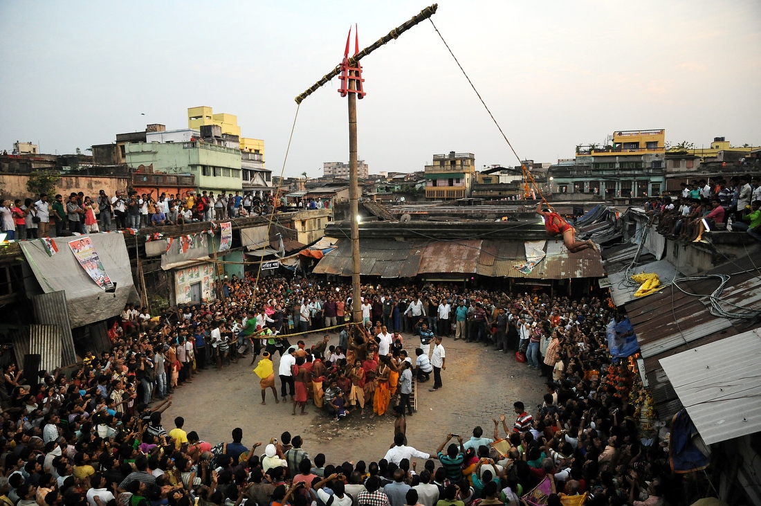 Калькутта, штат Западная Бенгалия. Индусы с большой скоростью крутятся на колесе, присоединенном к «дереву Чарак» — это такой длинный шест. Особо верующие подвешивают себя к колесу на крюк. Крутящийся индус разбрасывает вокруг себя прасад — предварительно благословленные сласти.