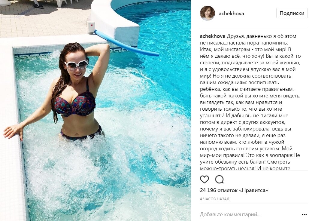 На данный момент звезда и ее сын Соломон находятся на отдыхе. Там актриса часто загорает и отдыхает возле бассейна. В один из таких моментов телеведущую запечатлели в раздельном купальнике. Анфиса похвасталась подтянутым животиком и очень тонкой талией. В подписи к фото звезда попросила поклонников поменьше критиковать ее фото в микроблоге.
