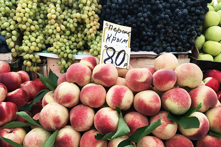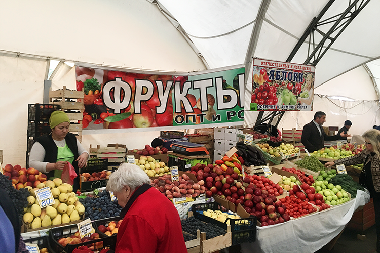Мне нравится, что рынок негласно делится на две части: подешевле и подороже. Первая находится на улице под купольным навесом. Там десятки развалов, в основном с плодоовощной продукцией. На некоторых точках сливают очень нежный переспелый товар по смешным ценам — помидоры, груши, персики можно купить в сезон по 30–70 р. за килограмм. Общая планка цен здесь существенно ниже, чем на рынках выходного дня, даже если сравнивать с воскресными днями, когда распродают остатки. Часть продуктов сюда везут с того же «Фуд Сити», поэтому цен ниже в Москве просто не найти.