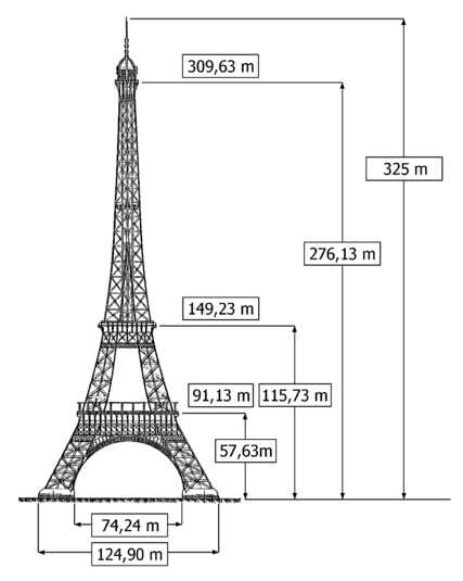 Нижний этаж представляет собой пирамиду (129,3 м каждая сторона в основании), образуемую 4 колоннами, соединяющимися на высоте 57,63 м арочным сводом; на своде находится первая платформа Эйфелевой башни. Платформа представляет собой квадрат (65 м в поперечнике).