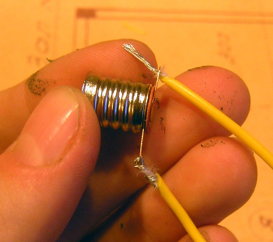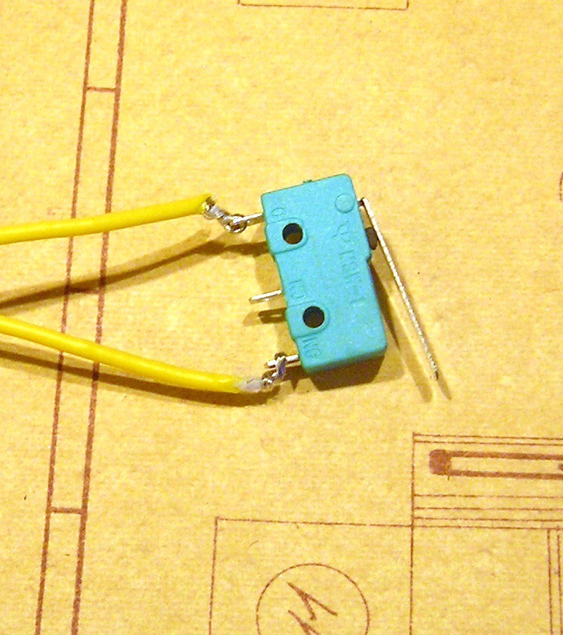- Отрежь два куска провода и срежь с обеих сторон покрытие, чтобы они стали оголенными. Вставь одни концы в «ушы» патрона, а другие – в микропереключатель. Закрути.