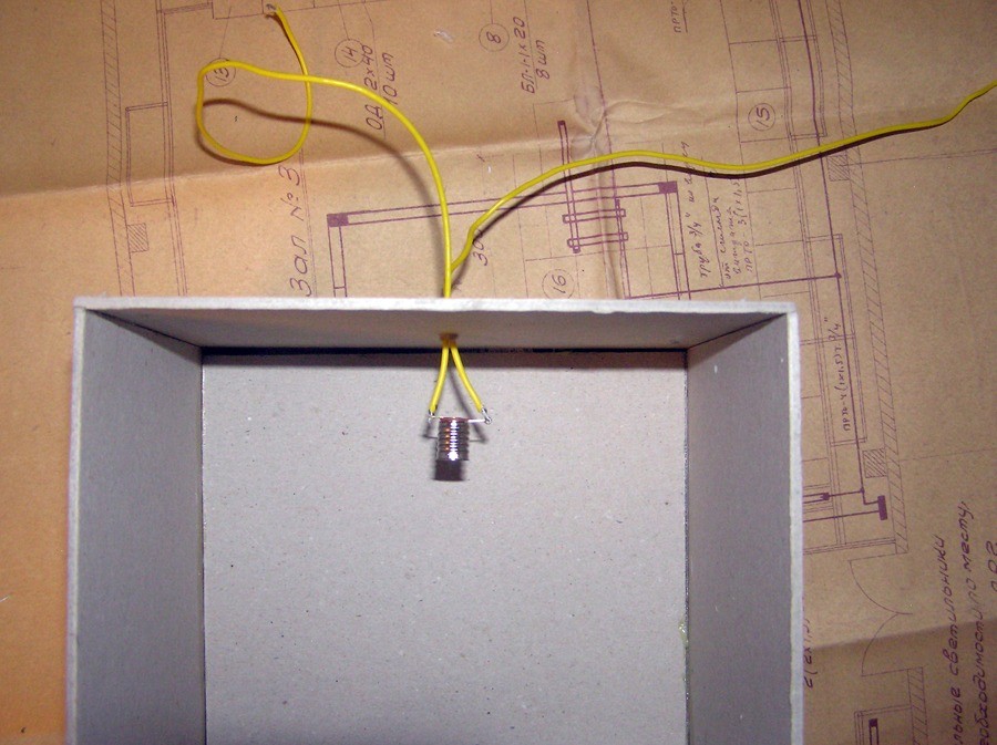 - Прикрепи к задней стенке корпус для батареек и соедини его с патроном и переключателем. Для этого нужно оголить концы проводов, скрутить их между собой и наклеить сверху изоленту.