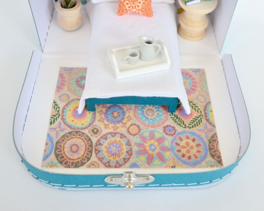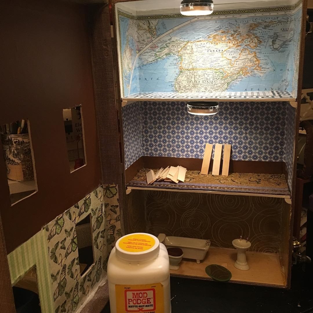 - Это не полноценный кукольный домик для Барби своими руками, а, скорее, переносной вариант, если у ящика или чемодана есть крышка. Просто обклей его обоями, а затем сделай в картоне отверстия для окон.