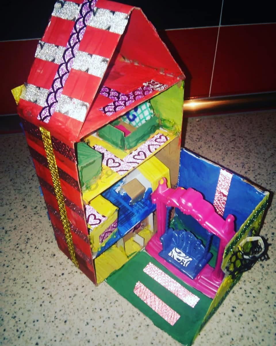 - Края домика можно обклеить коричневой пленкой под дерево, а стены – остатками обоев, цветной бумагой, тканью или вырезками из журналов. Главное, чтобы цвет материалов вписывался в общую концепцию.