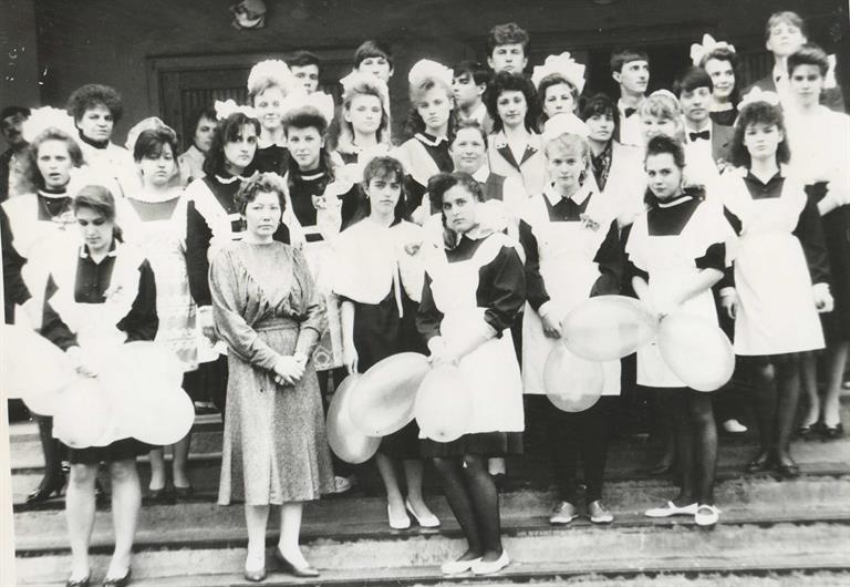 В свой последний «детский» день девушки приходили в школу в привычных коричневых платьях, парадных белых фартуках и гольфах. Чуть позже непременным атрибутом наряда стали приколотые к школьной форме маленькие колокольчики и ленты с надписью «выпускник».