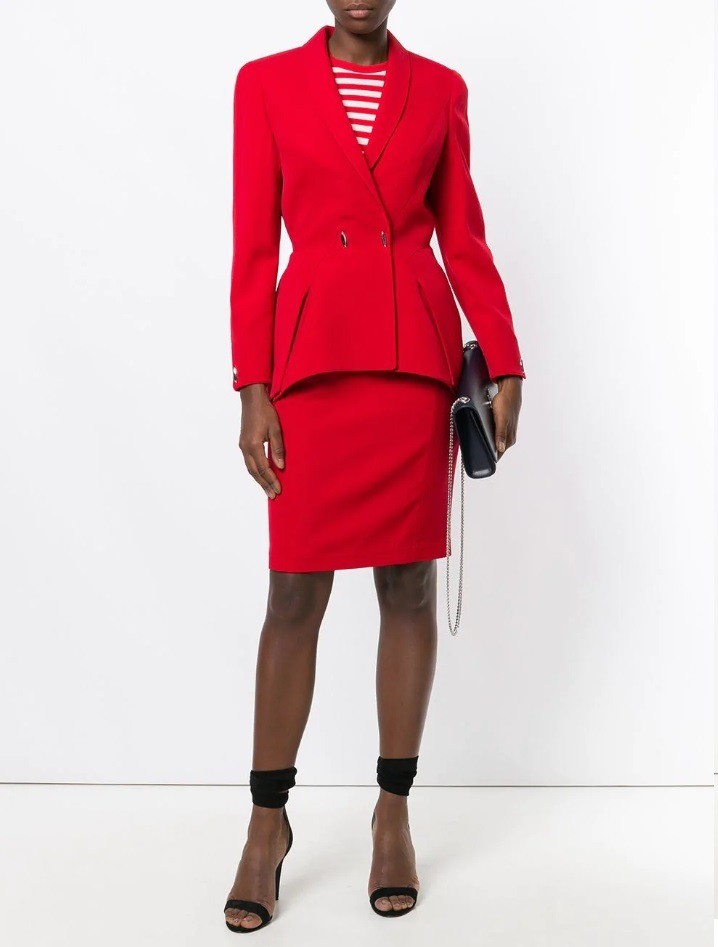Разрешается и другая одежда, помимо платья — шелковый комбинезон классического кроя, брючный костюм и прочее.