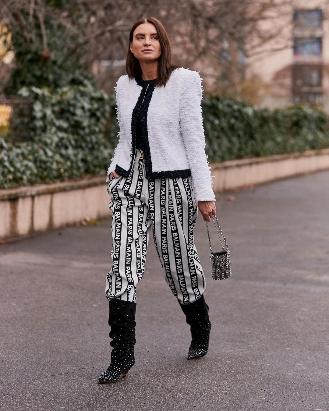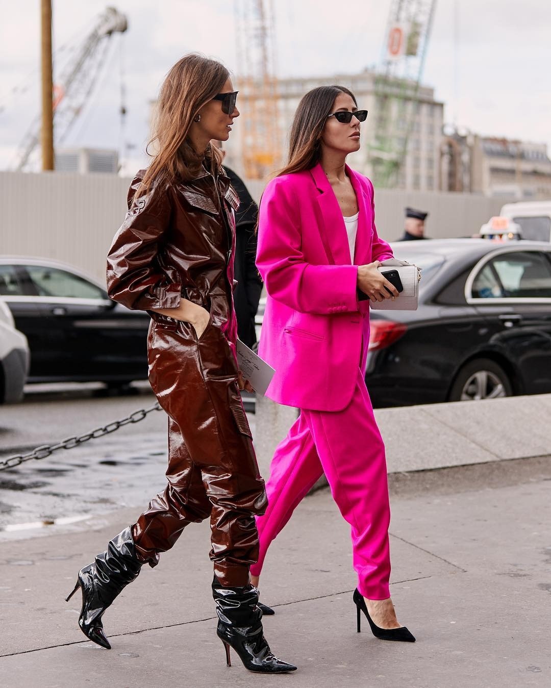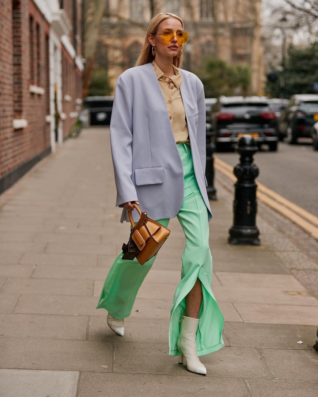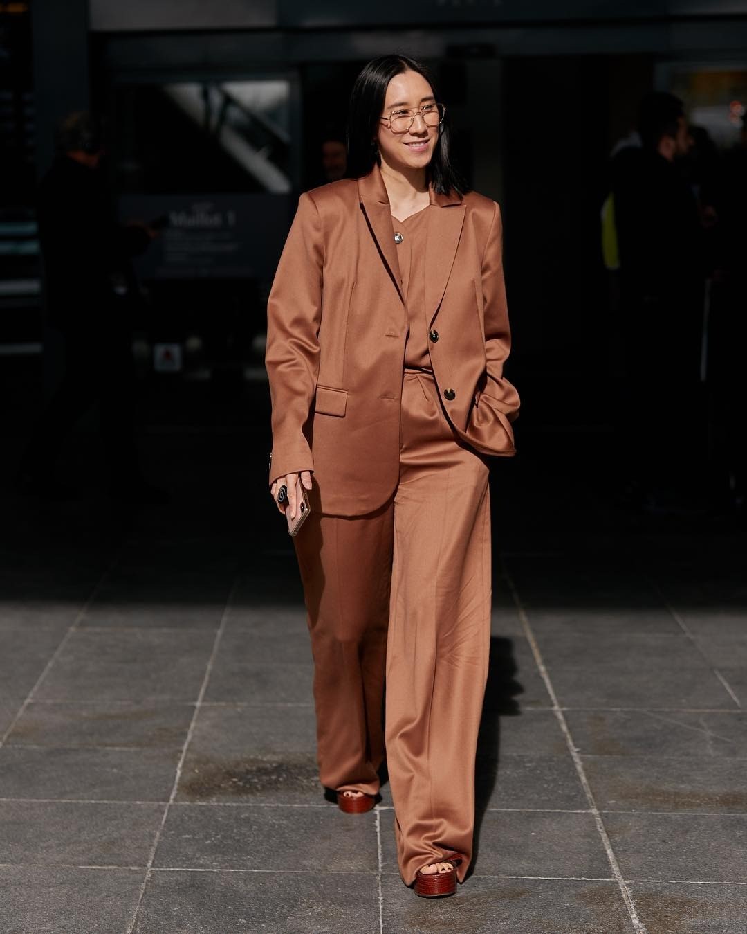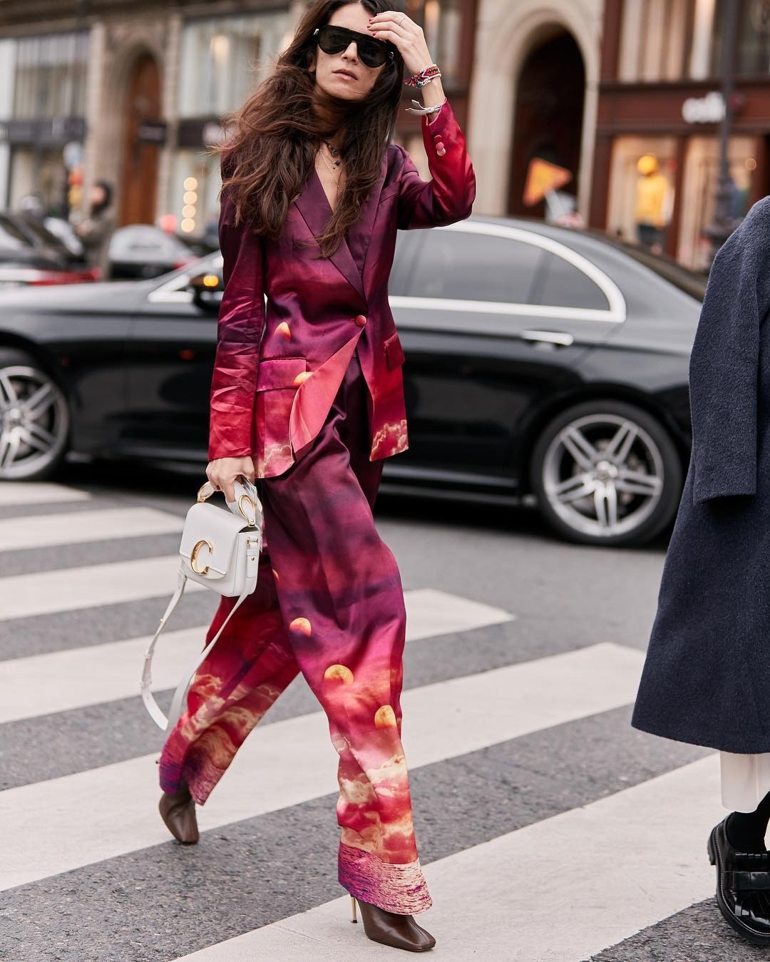 Например, брючный костюм яркого оттенка или с динамичным принтом, платье необычного кроя или сочетание вечернего элемента одежды с повседневным (шелковые брюки и кашемировый пуловер).