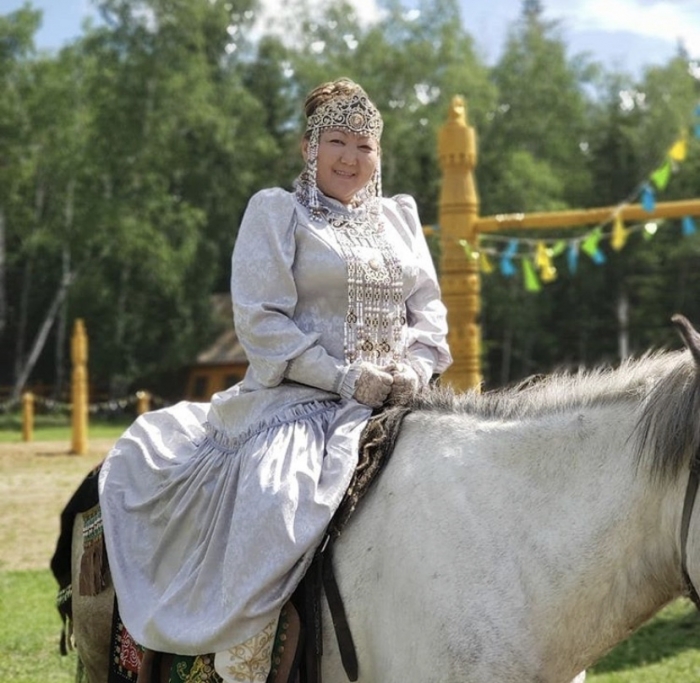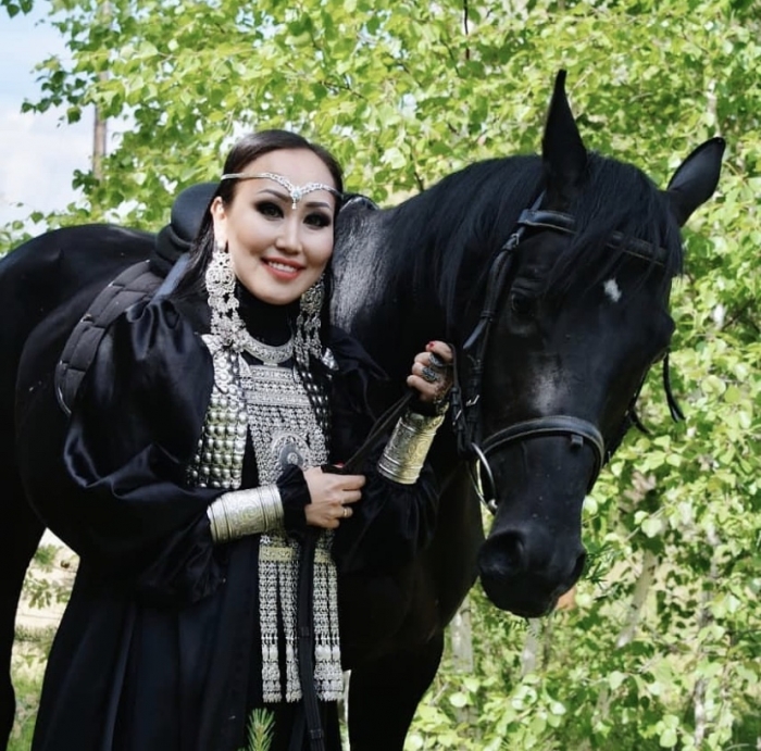 Прекрасная наездница, хомусист-виртуоз мира Альбина Дегтярева выехала на просторы алааса в атласном костюме сочного оттенка, граничащего между зеленым и цветом морской волны.