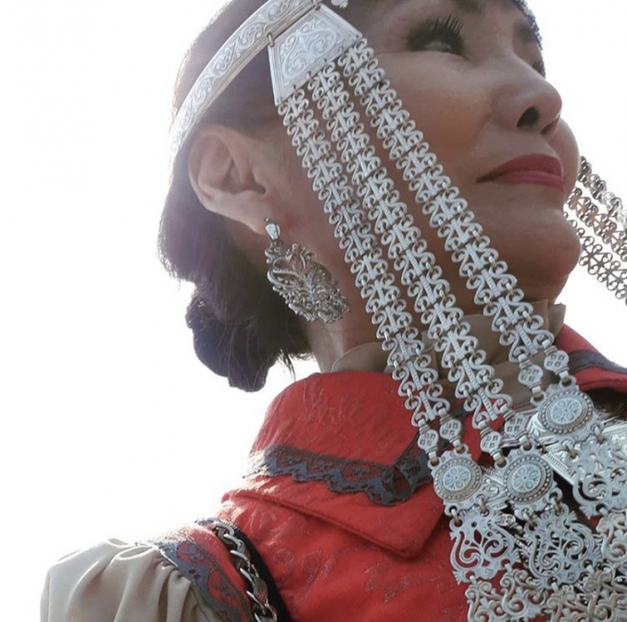 Изысканные серебряные украшения дополнили солнечный оранжевый наряд диктора республиканских и правительственных мероприятий Сарданы Федоровой.