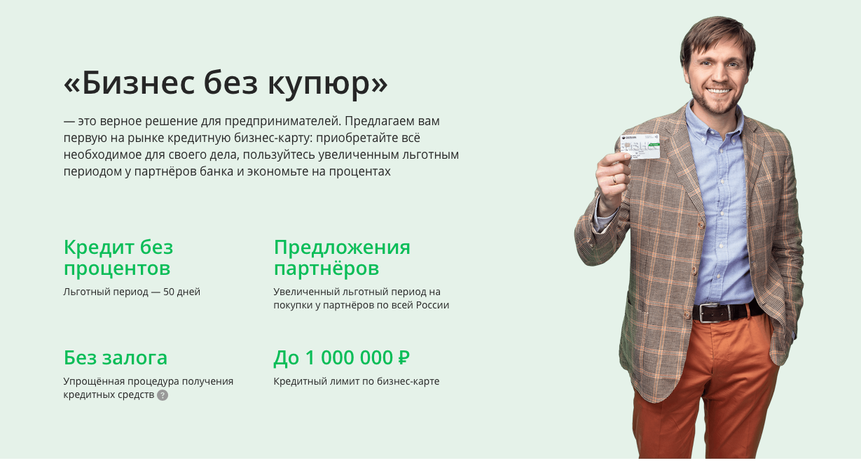 На случай незапланированных трат. Карта придет на выручку, если срочно надо что-то купить для бизнеса. «Для моей компании кредитка — это настоящая подушка безопасности при определенных обстоятельствах, — рассказывает владелец ресторанов авторской кухни в Ижевске Сергей Григорьев. — Например, если на завтрашний день запланировано торжество, а у вас нет лосося, то его можно в любой момент поехать и купить, даже если нет отложенных денег или наличных в кассе». Если надо закрыть кассовый разрыв. Предприниматель может оплатить при помощи карты аренду помещения, рассчитаться с сотрудниками, поставщиками. Например, деньги за отгруженный хлеб обещают перевести на счет на следующей неделе, но заплатить за муку для производства новой партии нужно уже завтра. Просрочка оплаты грозит разрывом контракта с поставщиком или начислением пени согласно договору. Благодаря кредитной бизнес-карте рассчитаться по обязательствам можно в срок. А через неделю, когда деньги поступят на счет, вы закроете задолженность. А так как период закрытия долга не превысил 50 дней, вам не придется платить проценты, если вы расплачивались безналично.Чтобы получать выгоды бизнес-карты. Держатели кредитных бизнес-карт могут принимать участие в акциях и получать скидки, которые предоставляют платежные системы и банк. Для этого следите за новыми предложениями на сайте Сбербанка и на сайтах платежных систем. Кроме того, держатели кредитных бизнес-карт могут закупать продукцию у партнеров Сбербанка, которых более 400, и пользоваться увеличенным льготным периодом — вплоть до 110 дней.Как работает карта «Бизнес без купюр»