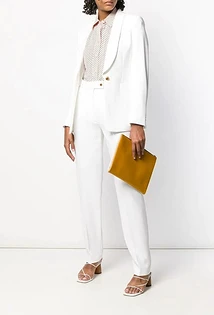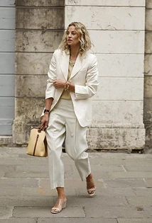 Один из самых стильных вариантов того, с чем носить белый пиджак женщине — с брюками из аналогичной ткани. Белые брючные костюмы идут практически всем девушкам и гармонично смотрятся со множеством разных аксессуаров. Можно составить монохромный образ в белом цвете, дополнив комплект сумкой, обувью и украшениями в тон. Или же расставить акцент с помощью ярких контрастных деталей.