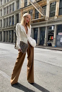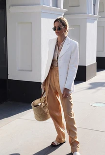 Для повседневных образов выбирай комплект из длинных широких брюк и оверсайз жакета. Его можно носить с городскими кроссовками, текстильными ботильонами или атласными мюлями. В качестве базы под пиджак вбирай топ в бельевом стиле, водолазку или футболку неонового цвета.
