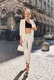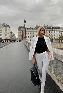 Под белый пиджак подойдет практически любая база: от топов-бандо до трикотажных джемперов и водолазок. Если ты выбираешь их в белом цвете, то следи за тем, что они совпадали по оттенку с жакетом, иначе образ будет выглядеть неопрятно и дешево.