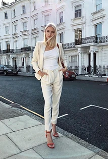 Такое сочетание подойдет и для лета, и для холодного времени года. В первом случае можно выбирать белые костюмы с жакетом и шортами, льняные комплекты, во втором — выбирай костюмы из более плотных и теплых тканей.