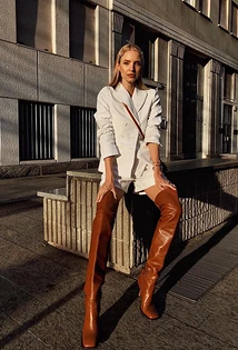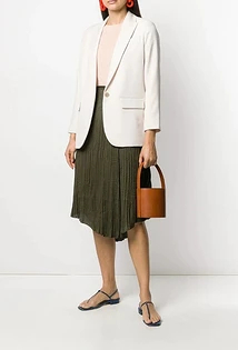 Приталенные короткие жакеты носи с пышными юбками длины миди или макси. Удлиненные пиджаки прямого кроя будут гармонировать с юбкой-карандашом, плиссированной юбкой асимметричного кроя, с мини облегающего силуэта. В последнем случае дополняй лук высокими сапогами-гармошками или ботфортами.