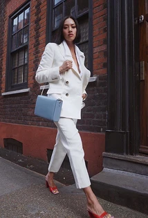 Кроме того, белый костюм с укороченными зауженными брюками и удлиненным пиджаком отлично подойдет в качестве наряда на вечеринку. Дополни его миниатюрной бархатной сумкой-торбой, длинными черными серьгами и поясом-корсетом.