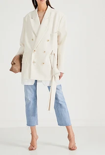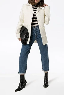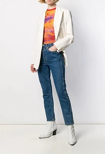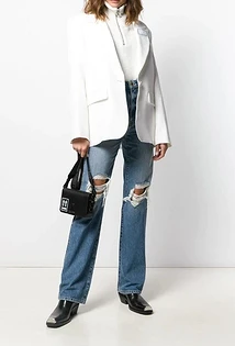 Идеальное сочетание дадут светло-голубые джинсы и белый жакет. Такой комплект освежит внешний вид и будет выглядеть модно и современно. Заверши лук светлыми замшевыми кроссовками, небольшой сумкой пастельного цвета и аккуратными очками. В качестве базы под жакет подойдет базовая белая футболка (главное, чтобы она совпадала по тону с пиджаком), топ с принтом или надписью, или рубашка прямого кроя.