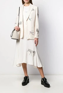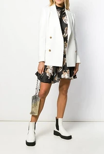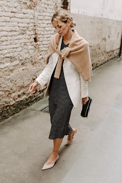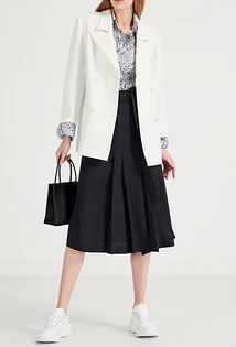 Белые пиджаки с рукавом три четверти советуем носить с миди-платьями А-силуэта и туфлями «Мэри Джейн». Также они отлично подойдут с лаконичным вечерним платьям, особенно если добавить на запястья широкие браслеты в стразах.