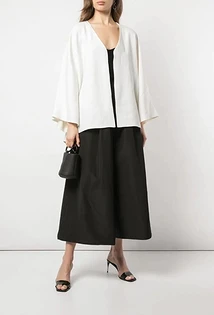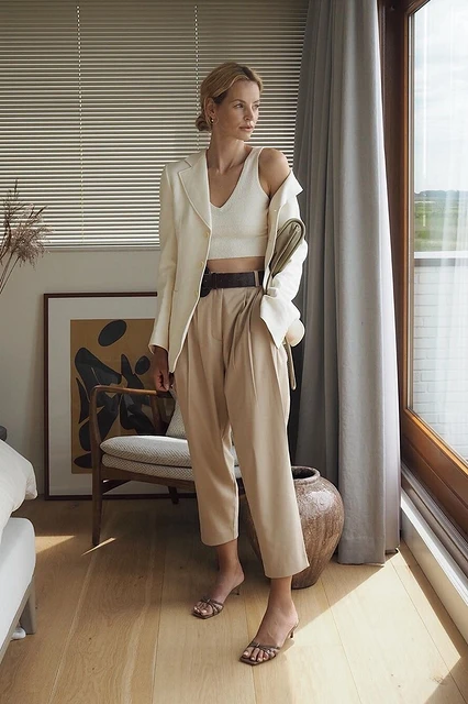 К классическим штанам, брюкам-бананам, расклешенным, палаццо и кюлотам подойдут удлиненные жакеты прямого кроя. Если брюки широкие, то на талию советуем добавить ремень, чтобы сделать акцент и сделать силуэт более структурированным.