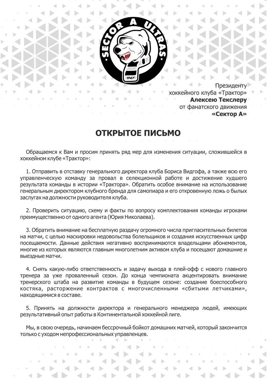 Также в открытом письме губернатору болельщики из «Сектора А» предложили ряд шагов по выводу команды из глубочайшего кризиса в новейшей истории: прежде всего, взять на посты директора и генменеджера специалистов, имеющих результативный опыт в Континентальной хоккейной лиге, пересмотреть подход к селекционной работе, а также снять ответственность с нового главного тренера за невыход в плей-офф в сезоне 2019/2020, а вместо этого разработать внятную концепцию на будущее.
