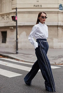 Если на брюках цветочный принт, этнические орнаменты или геометрические узоры, то верх лучше выбирать более сдержанный, чтобы аутфит не казался слишком перегруженным. Аксессуарами также не стоит сильно увлекаться. Выбирай минималистичные украшения и сумки.