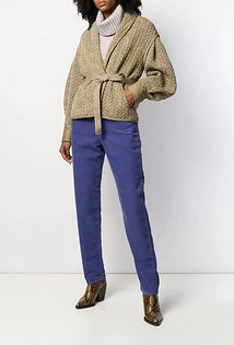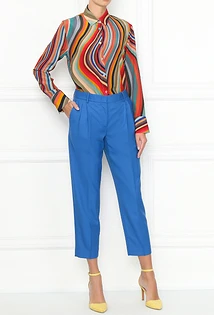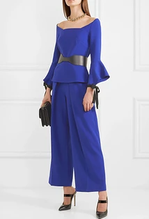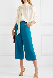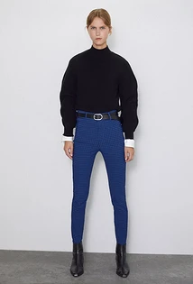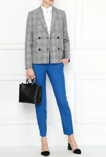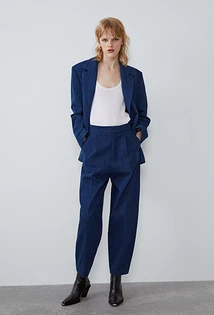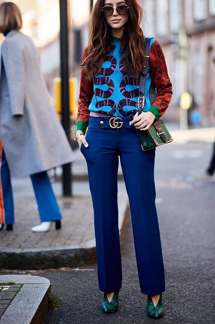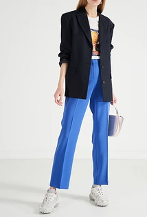 Что еще надеть женщине с синими брюками? Например, укороченный твидовый жакет. В этом случае можно выбрать любую модель штанов, но мы советуем остановиться на зауженных или слегка широких. Завершат аутфит текстильные остроносые ботильоны, брошь с искусственными камнями и стразами, а также однотонное пончо из шерсти или кашемира. Также можно выбрать приталенный жакет классического кроя, а под него надеть блузу с бантом на воротнике или облегающую яркую водолазку.