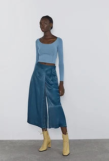 Здесь можно выбрать практически любые модели топов и футболок. Это могут быть майки с принтом тай-дай или с логотипом, асимметричные топы, укороченные варианты, а также многие другие вариации. Например, атласный топ сложного кроя будет хорошо гармонировать с узкими брюками. Если дополнить лук блестящими туфлями, босоножками или ботильонами, взять декорированный клатч и надеть мерцающие украшения, то получится удачный вечерний образ.