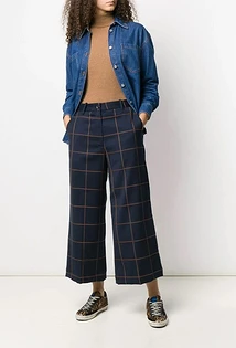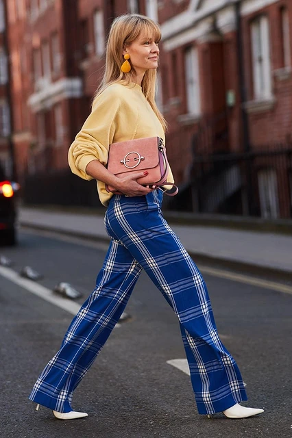 Синие брюки с принтами можно сочетать и с базовыми вещами, и с более интересными. Все зависит от того, с каким принтом у тебя будут штаны. Клетка легко миксуется практически со всем, так что здесь смело можешь дать волю фантазии. Например, отлично подойдет белая футболка с фотопринтом, топ в горох или в полоску.