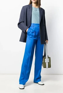 Если не знаешь, с чем женщинам стоит носить расклешенные синие брюки, то мы советуем подобрать к ним приталенный удлиненный пиджак с утрированной линией плеч. Получится образ немного в духе 70-х годов. Его отлично дополнят туфли или ботильоны на платформе, сумка почтальонка и бархатный ободок.