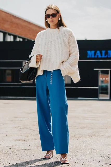С цветными и принтованными свитерами советуем надевать брюки светлых или пастельных оттенков синего. Например, с ними отлично будут сочетаться свитера с анималистичными и цветочными принтами, с геометрическими узорами и этническими орнаментами. Большое количество аксессуаров здесь не требуется, а вот обувь можно выбрать интересную, например, с декоративными элементами, необычными фигурными каблуками, вышивкой и так далее.