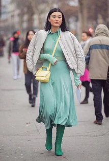 Красиво такие куртки-зефирки смотрятся с водолазками или свитерами плотной вязки, выглядывающими из-под верхней одежды. Обувь к ним часто подбирают массивную — кроссовки, туфли на блочном каблуке, сапоги или ботинки.