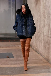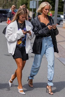 Куртку оверсайз короткой длины можно надевать с обычными джинсами, прямыми или свободными. Притом такая комбинация может смело дополняться крупной акцентной обувью — массивными ботинками или сапогами в ковбойском стиле. Тогда будет найден баланс между крупным верхом и низом.