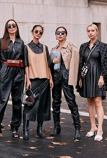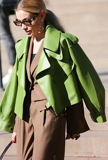 Отлично смотрится кожаный тотал-лук, даже если вещи не являются комплектом. Это выглядит дерзко и вызывающе, неизменно привлекает внимание. Особенно, если дополнить аутфит грубыми армейскими ботинками. Также яркая кожаная куртка будет выглядеть очень стильно с классическим костюмом-двойкой.
