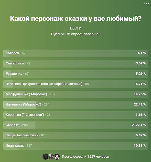 По итогам голосования Настенька из сказки "Морозко" все-таки опередила Бабу Ягу, но всего на 0,3 процента: