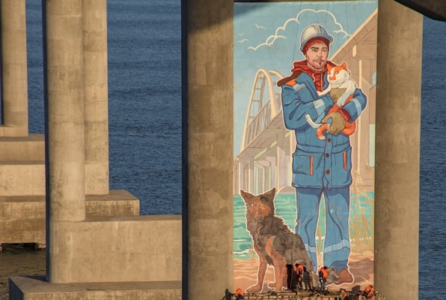 После завершения строительства Крымского моста инженеры и рабочие покидают строительную площадку.