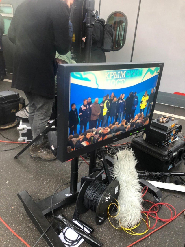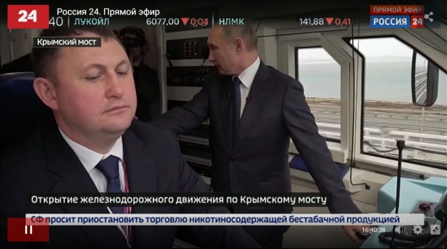 Тем временем испытательный поезд из трех вагонов с Владимиром Путиным в кабине машиниста идет по Крымскому мосту. Президент расспрашивает сопровождающих лиц о готовности к регулярному пассажирскому движению.