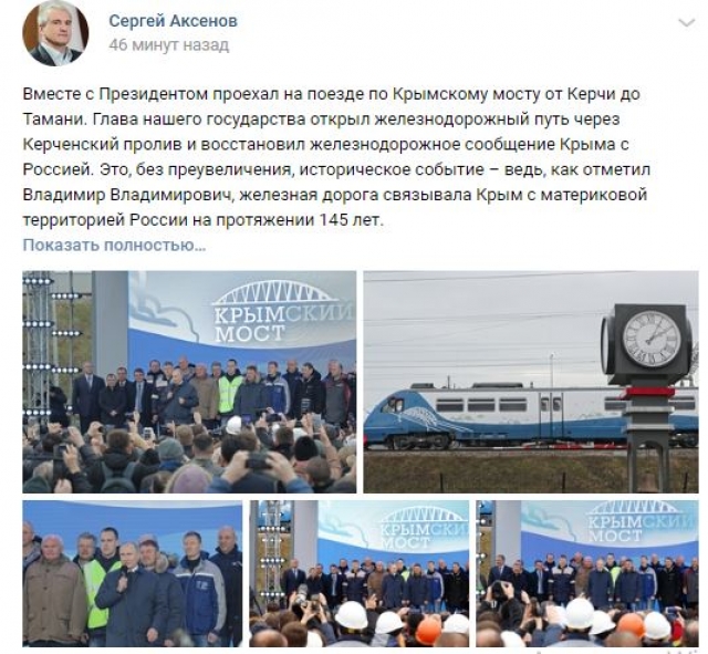 «Крымский мост — эпохальное событие, те решения, которые принял наш президент, и строители, которые исполнили эту мечту крымчан, я думаю, всех россиян, заслуживают огромного уважения. Сегодня крымчане встречают первый поезд с хорошим настроением с утра. Многие, наверное, встречают даже не пассажиров, а сам поезд — настолько это ожидаемое событие для Крыма», — заявил 25 декабря журналистам глава Крыма Сергей Аксёнов.