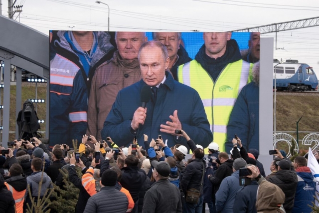 Владимир Путин едет по железной дороге Крымского моста. kremlin.ru