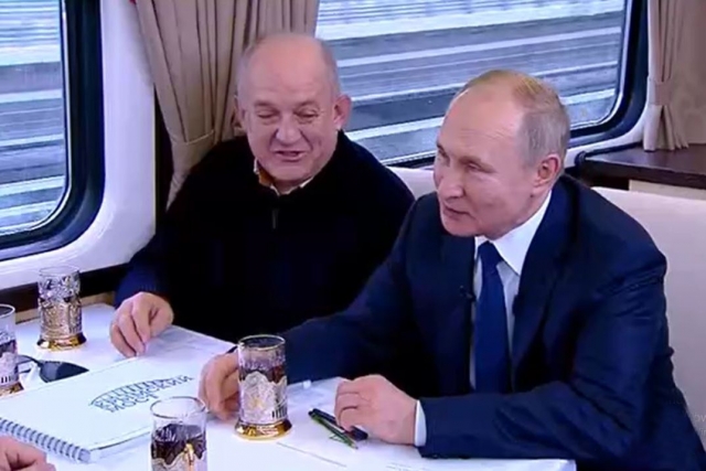 Владимир Путин пьёт чай с мостостроителями в вагоне поезда, который движется по Крымскому мосту.
