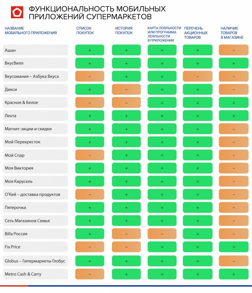Среди оцененных приложений – "Ашан", "ВкусВилл", "Вкусомания – Азбука Вкуса", "Дикси", "Красное&Белое", "Лента", "Магнит: акции и скидки", "Мой Перекресток", "Мой Спар", "Моя Виктория", "Моя Карусель", "О’Кей – доставка продуктов", "Пятерочка", "Сеть Магазинов Семья", "Billa Россия", "Globus – Гипермаркеты Глобус", Fix Price и Metro Cash & Carry.