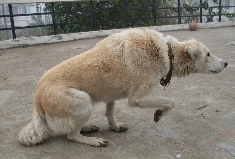Эта поза известна как агрессивное преследование. Когда собака опускает голову, сосредотачиваясь на одном месте, поднимает переднюю лапу в воздухе, это означает, что она на охоте. Лучше уйти с ее пути, так как она, вероятно, собирается наброситься.