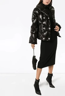 Для образа в стиле спорт-шик дополняй пуховик и брюки-карго остроносыми ботильонами на каблуке, модными узкими очками с цветными линзами, крупными украшениями и небольшой фактурной сумкой на цепочке.