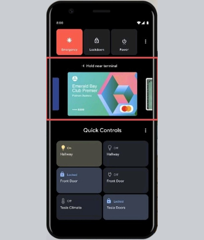 Кнопки для экстренного вызова, блокировки смартфона с отключением разблокировки по биометрии и выключения находятся в верхнем ряду. Под ними размещен блок с картами, добавленными в Google Pay.