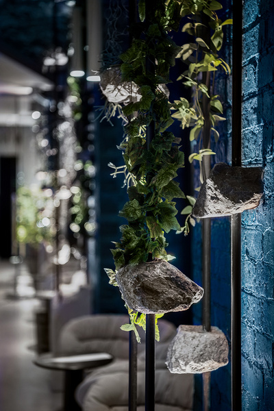 Центральное место в пространстве заняла барная стойка, символизирующая большую скалу на песке. Нужную форму дизайнеры вытачивали из гипсовых блоков. Стены выложены бетонными блоками с зернистой текстурой, на них художник, словно пальцем на песке, написал слово «bar».