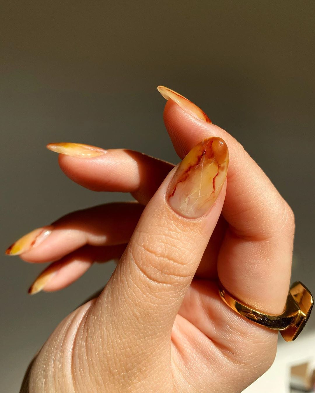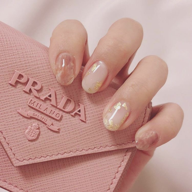 Маникюр, похожий на причудливый гибрид карамельки и розового кварца с редкими золотыми прожилками.