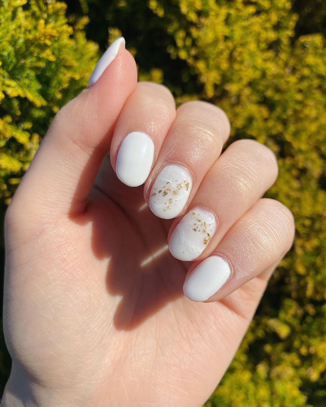 Чтобы белый лак не смотрелся скучно и плоско, попросите мастера по маникюру добавить мраморных прожилок и (если этого все еще мало) пару крошек золотой фольги.