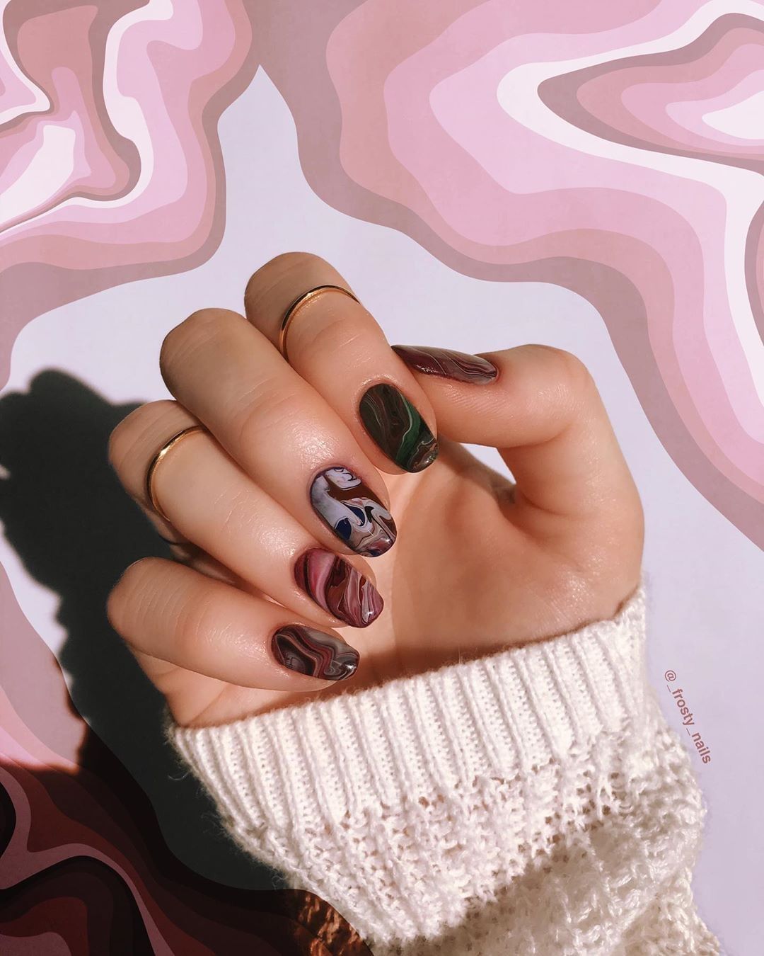 Если смелости на полностью мраморный маникюр пока не хватает, примерьте его на безымянном пальце, сделав частью акцентного маникюра.