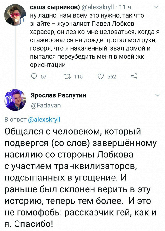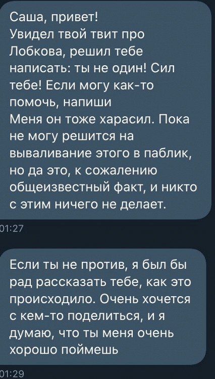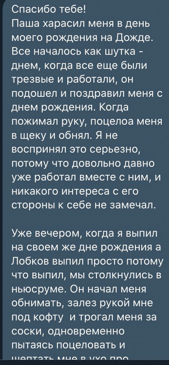 Несколько таких историй появилось в твиттере Саши Сырникова (пока что он временно ограничил доступ к своему профилю, однако у «Афиши Daily» остались скриншоты). Вероятные жертвы харассмента со стороны Лобкова жаловались на его бесцеремонные приставания к ним во время работы на телеканале. При этом, по их словам, руководство «Дождя» считало такое поведение «милым чудачеством».