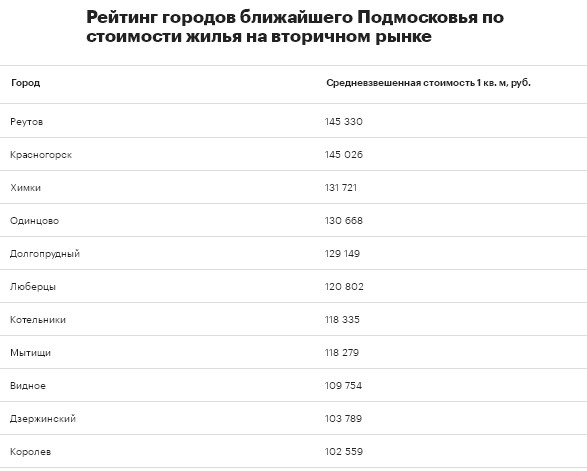 Городами с самым дорогим жильем оказались Реутов и Красногорск — здесь квартиру можно приобрести в среднем по цене 145 тыс. за "квадрат". Только в городе Дзержинский стоимость осталась на прежнем уровне — 103 тыс. за 1 кв. м, выяснили эксперты.