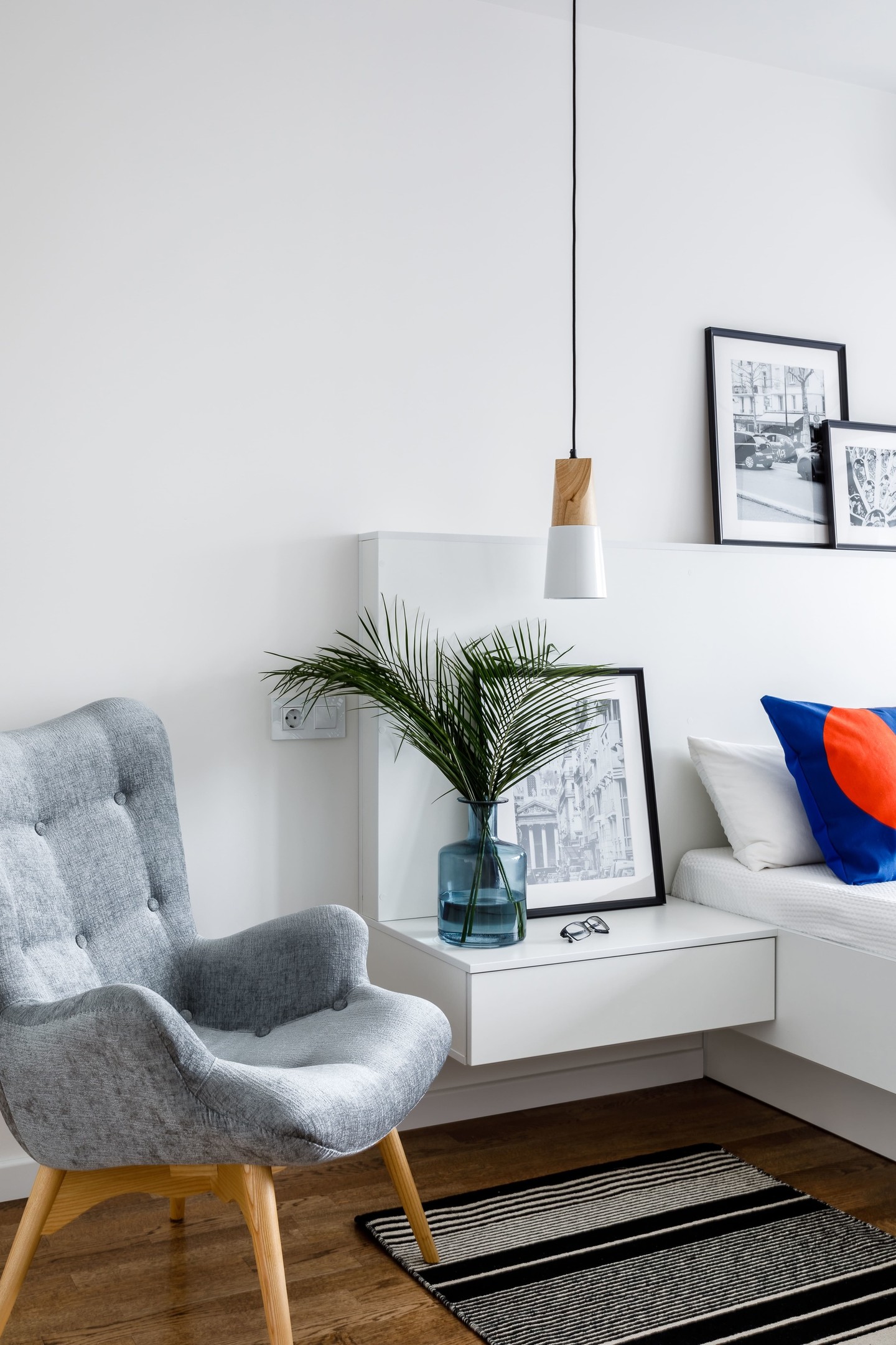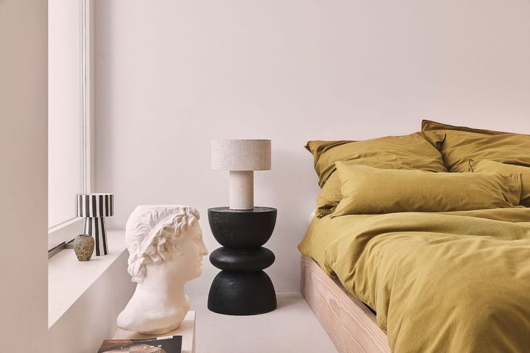 Еще один вариант прикроватного столика — использовать вместо него небольшой дизайнерский табурет. На него можно поставить настольную лампу, положить на ночь телефон или очки — а для более крупных вещей повесить полку на стене.
